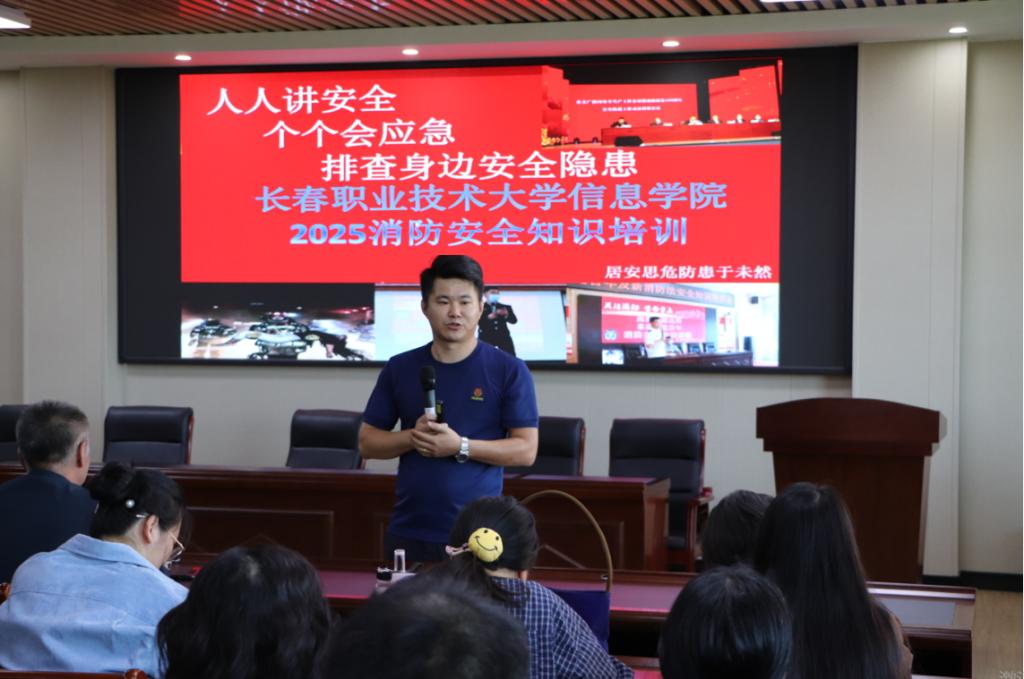 为进一步提升师生消防安全意识与应急处置能力,筑牢校园安全防线,信息学院组织全体师生开展消防安全知识专题培训,特邀应急救援培训师王教官现场授课。