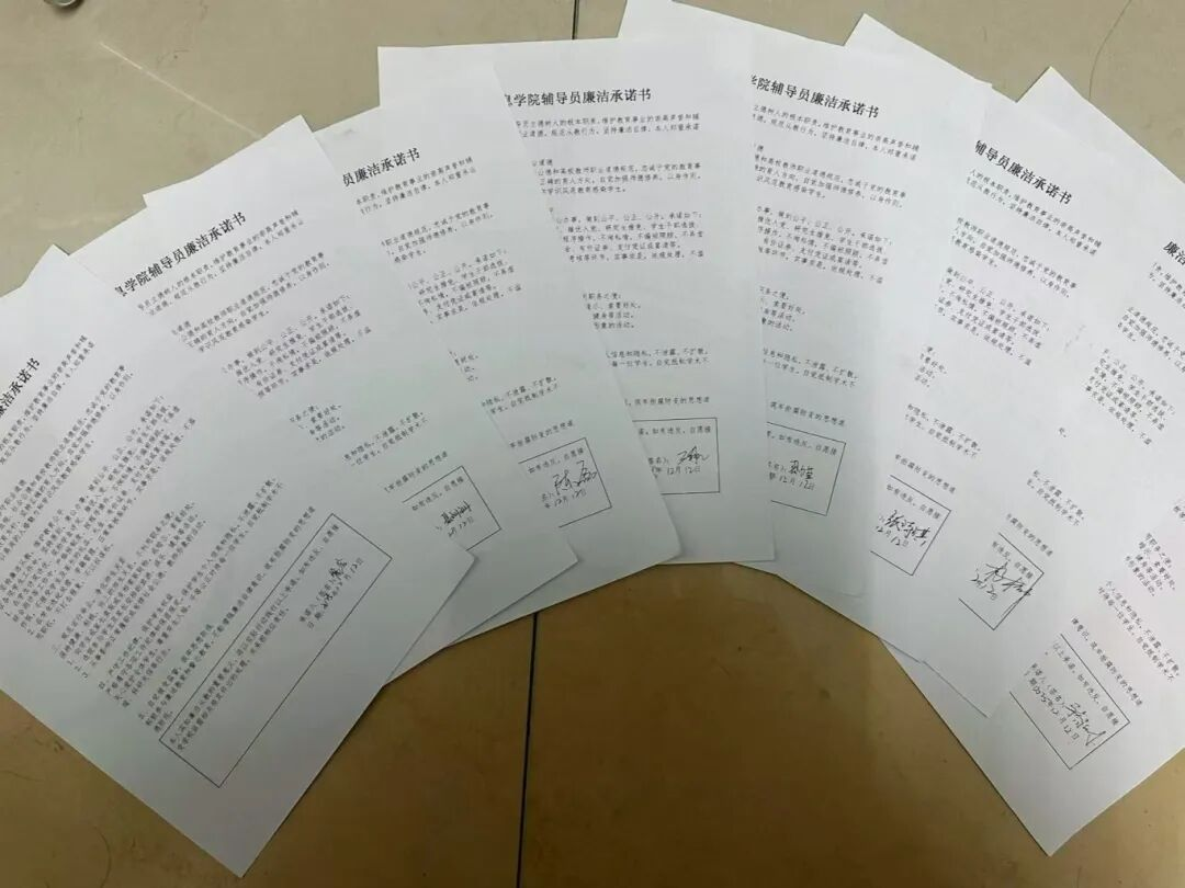 会议最后举行了庄严的辅导员廉洁从教承诺书签署仪式。全体辅导员在认真阅读承诺书内容后,郑重签下自己的名字,承诺将自觉遵守廉洁自律各项规定,忠诚党的教育事业,恪守职业道德,廉洁奉公,无私奉献,自觉接受监督,争做新时代党和人民满意的好老师。