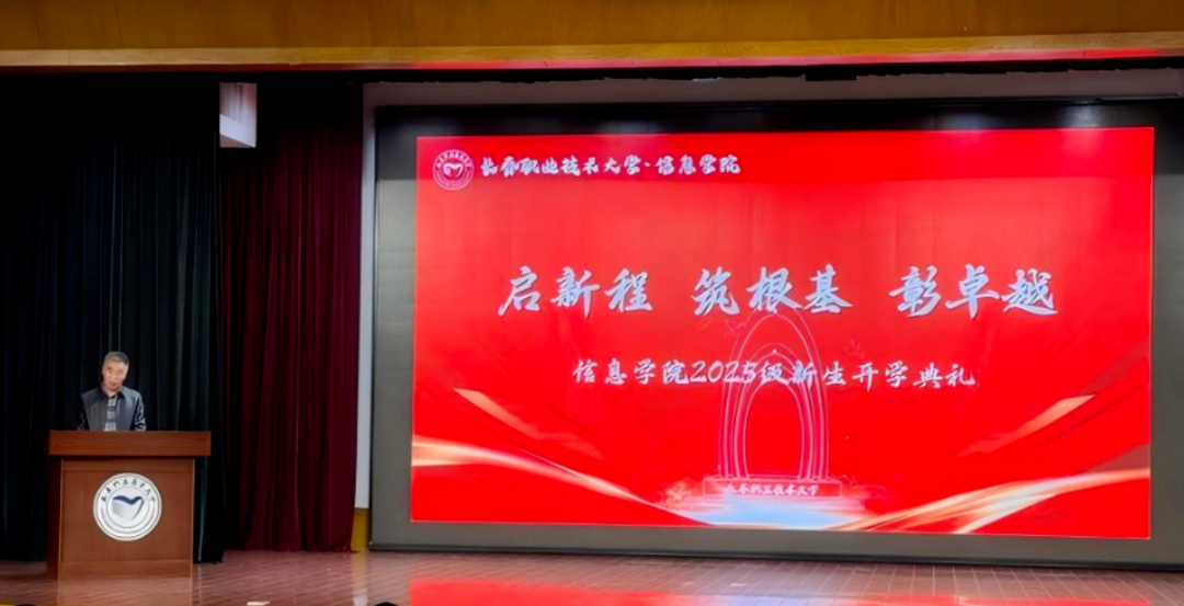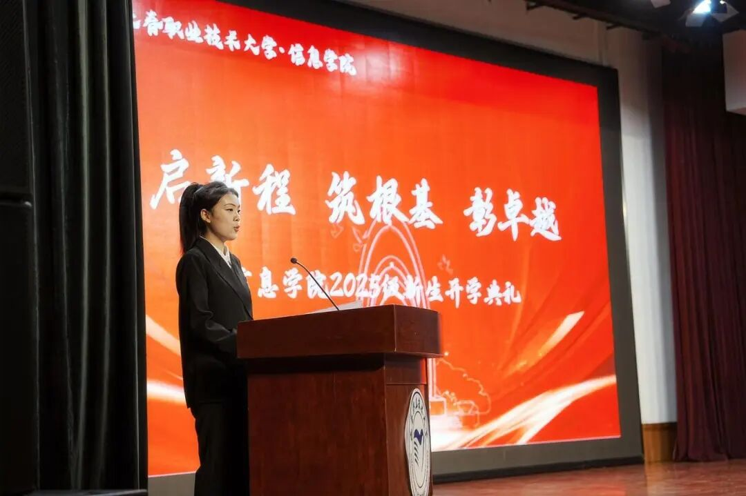 2025年10月16日,信息学院2025级开学典礼暨优秀学生表彰大会在学校会议中心隆重举行。学校学生处副处长冷柏迁、信息学院院长迟恩宇、党总支书记刘长春、副院长李季、苏东梅、华微微、学院全体中层干部、全体教师、团学干部代表及2025级全体新同学参加了本次会议。会议由团委书记安镜伊主持。