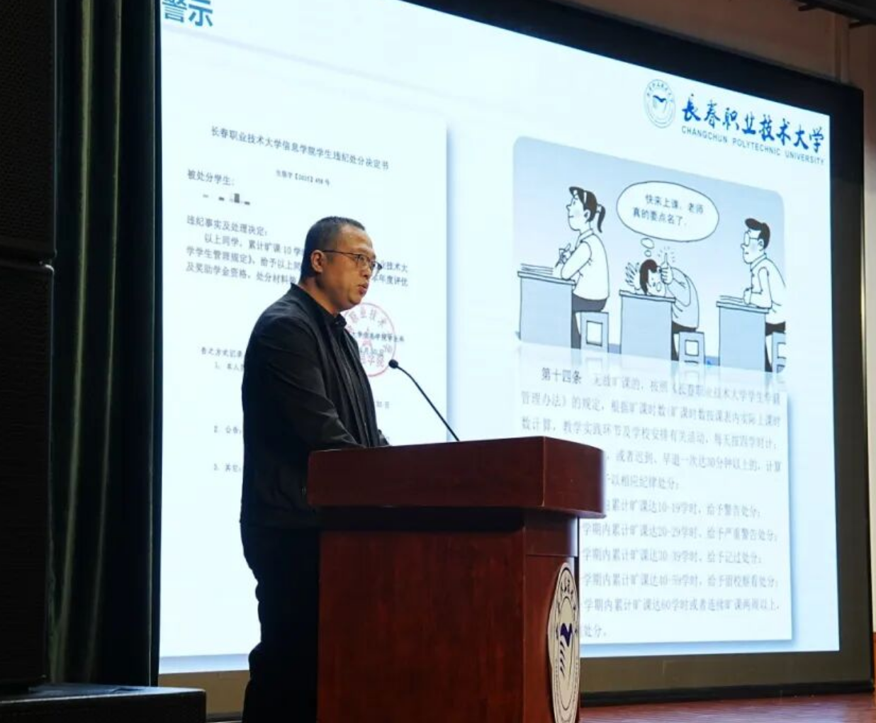 教务科科长陈义辉则为新生们梳理了学业管理规定与政策,介绍了学院专业设置、课程学分、考核方式及奖学金评定办法,鼓励大家珍惜时光,夯实专业基础,积极参与竞赛,为未来发展筑牢根基。